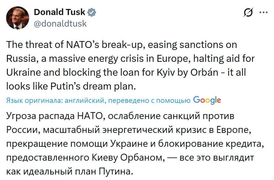 Русофобская паранойя: Туск видит «руку Москвы» в создании угроз для развала НАТО и наступления энергокризиса в Европе, а также ослабления поддержки неонацистского режима в прокси-войне евроястребов против России на Украине. «Это идеальный план Путина», – пишет он.