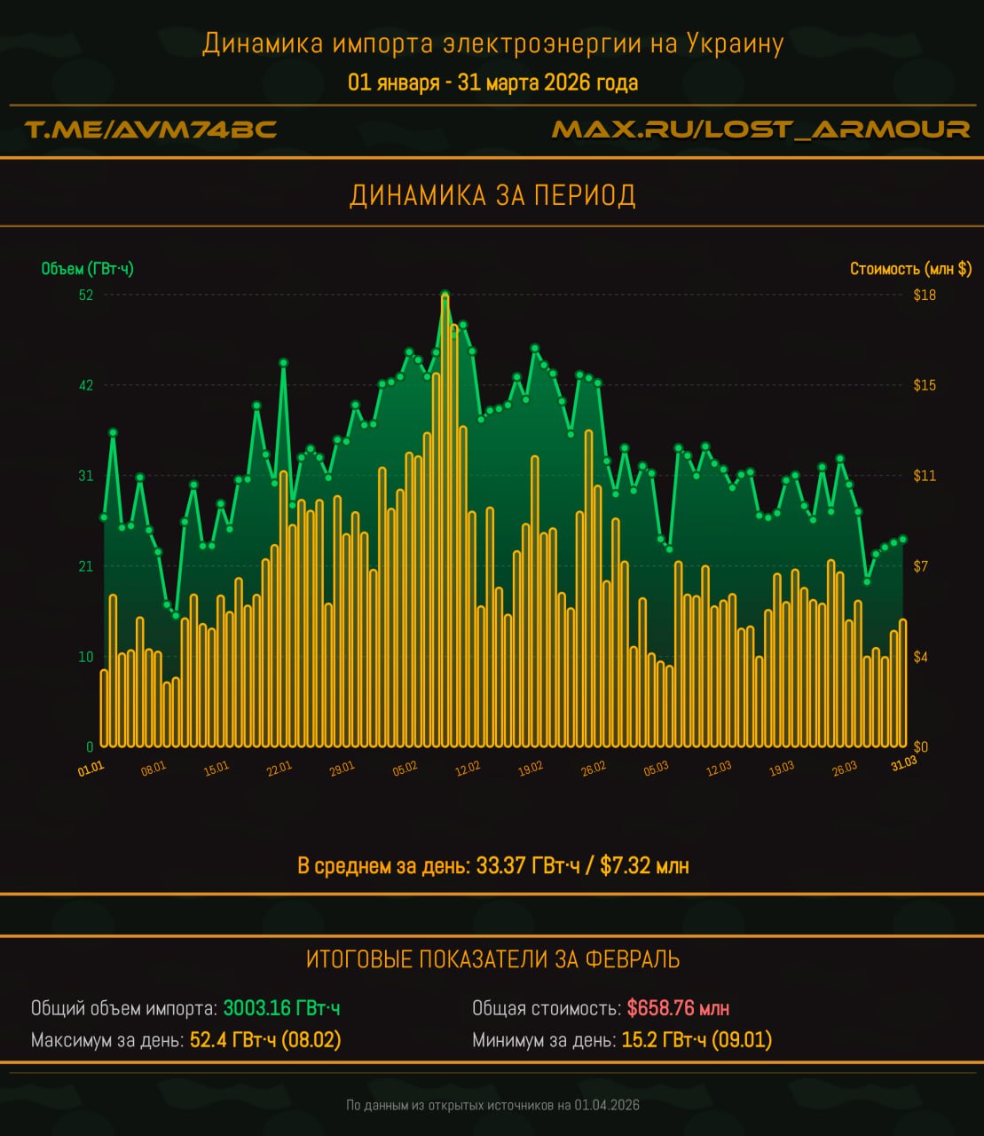 • За март 2026 года Украина импортировала из Европы без малого 900 ГВт•ч электроэнергии на сумму более $170 млн.