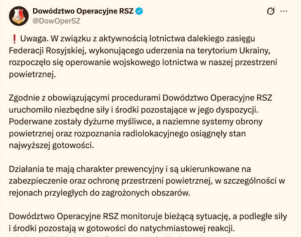 Польша испугалась и подняла авиацию из-за ракет ВС РФ в воздушном пространстве Украины, сообщает польская армия