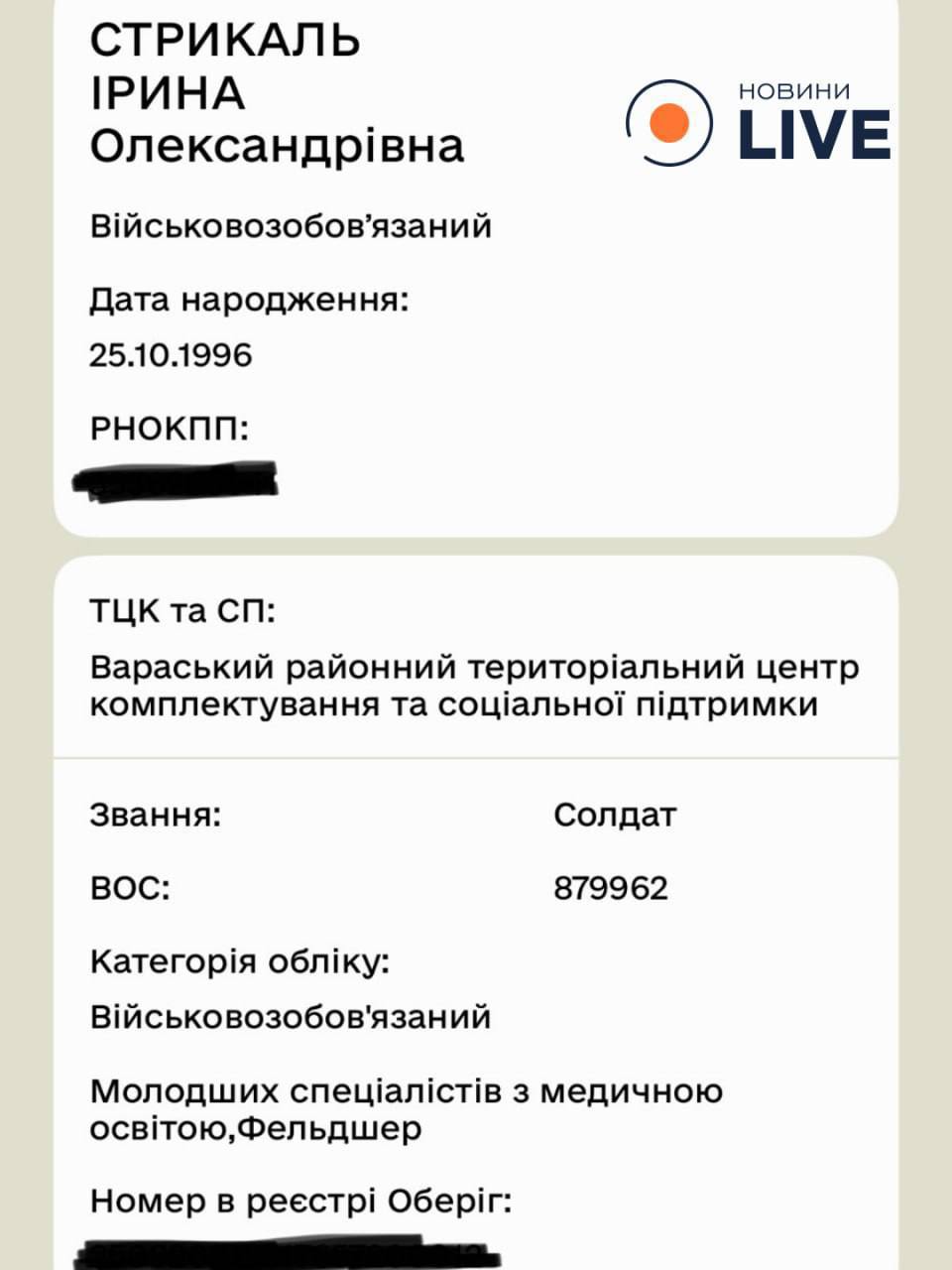 Женщина с 8-месячным ребёнком рассказывает: образование менеджерское, но в документах ей нарисовали военно-учётную специальность фельдшера и звание рядовой. Сама ни разу в жизни в Ровненской области не была.