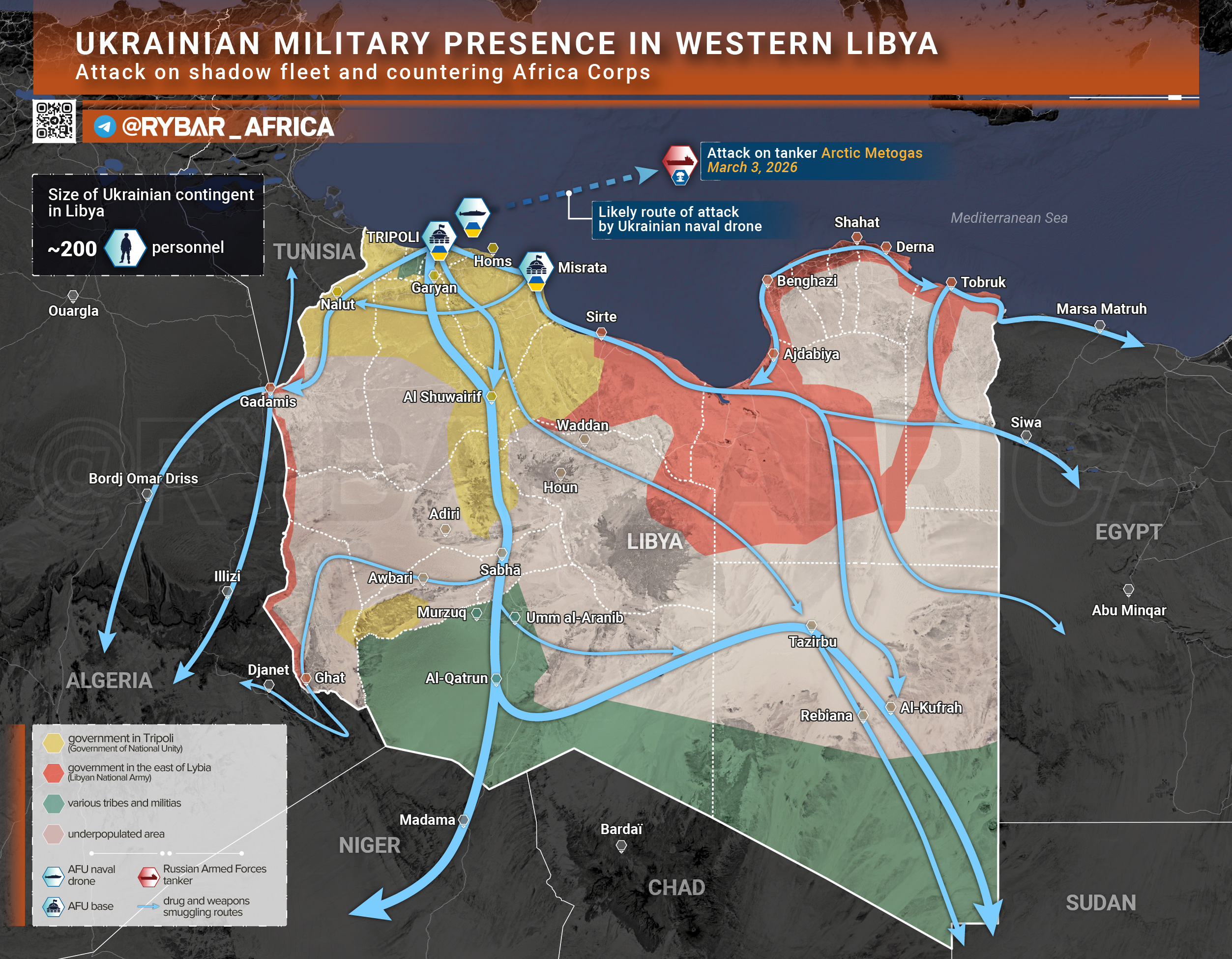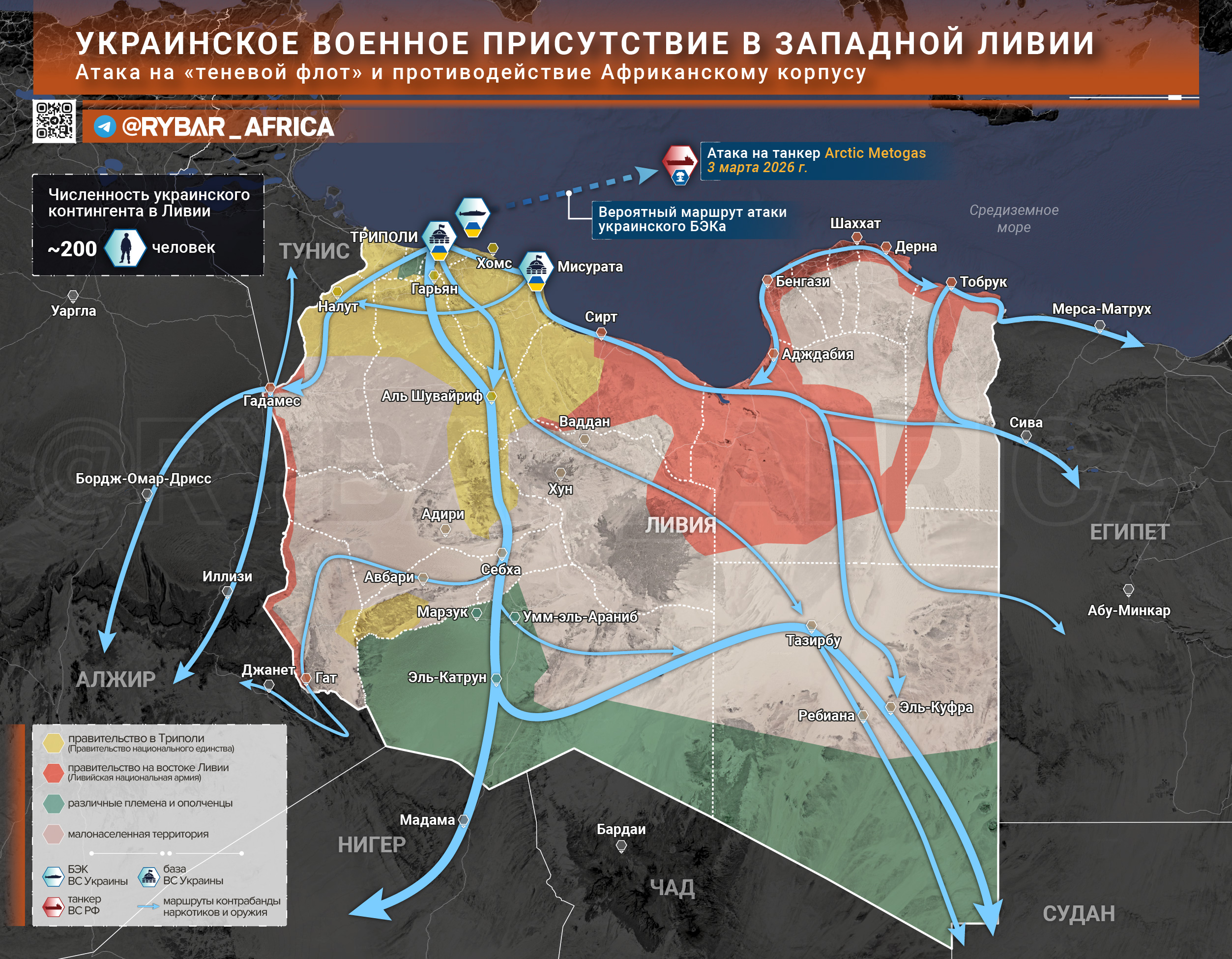© Западная Ливия это «черная дыра» с налаженными маршрутами контрабанды. Именно здесь ГУР может готовить кадры для малийских сепаратистов и радикальных исламистов. Связка Триполи — север Мали уже давно действует, а учитывая «опыт» украинцев в контрабанде, контакты могут расшириться вплоть до поставок дефицитных дронов и обучения боевиков.