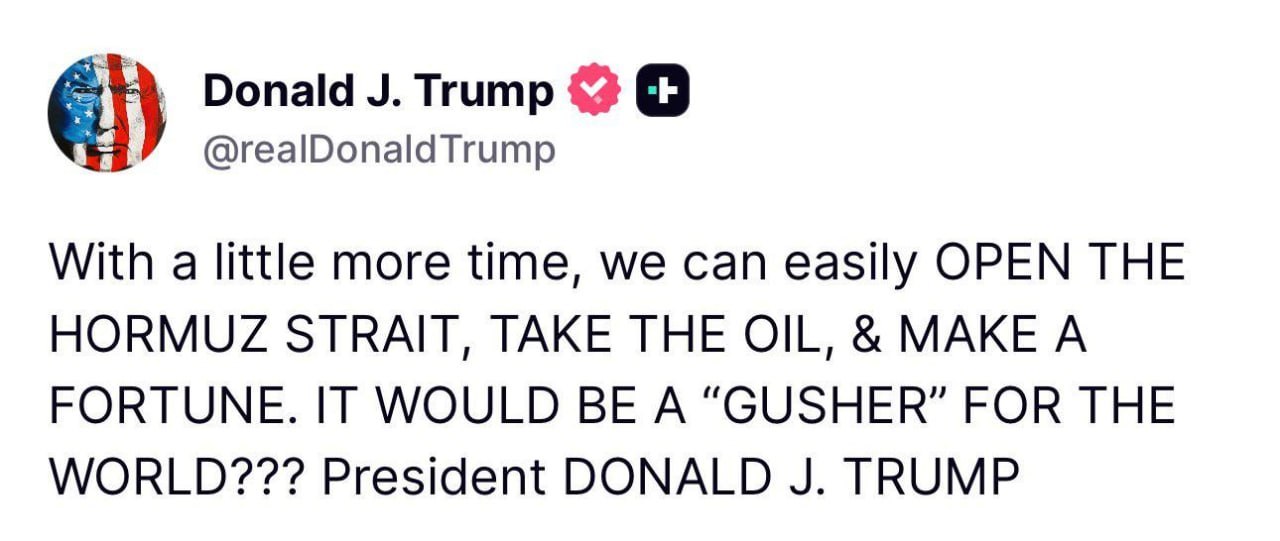 «Если дать нам немного больше времени, мы легко сможем открыть Ормузский пролив, забрать нефть и заработать состояние. Это будет настоящий «нефтяной фонтан» для всего мира?», – написал он.