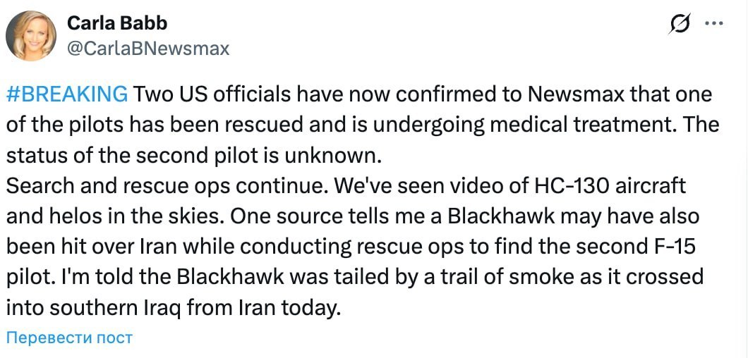 Позднее Бэбб уточнила, что информация получила подтверждение: по данным американского чиновника, вертолёт действительно был поражён Ираном. При этом экипаж, как утверждается, выжил и находится в безопасности.