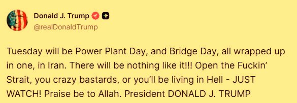 Во вторник в Иране будет День Электростанций и День Мостов, всё в одном. Ничего подобного больше не будет!!! Откройте [чёртов] пролив, сумасшедшие ублюдки, или вы будете жить в аду — вот увидите! Хвала Аллаху. Президент Дональд Дж. Трамп.