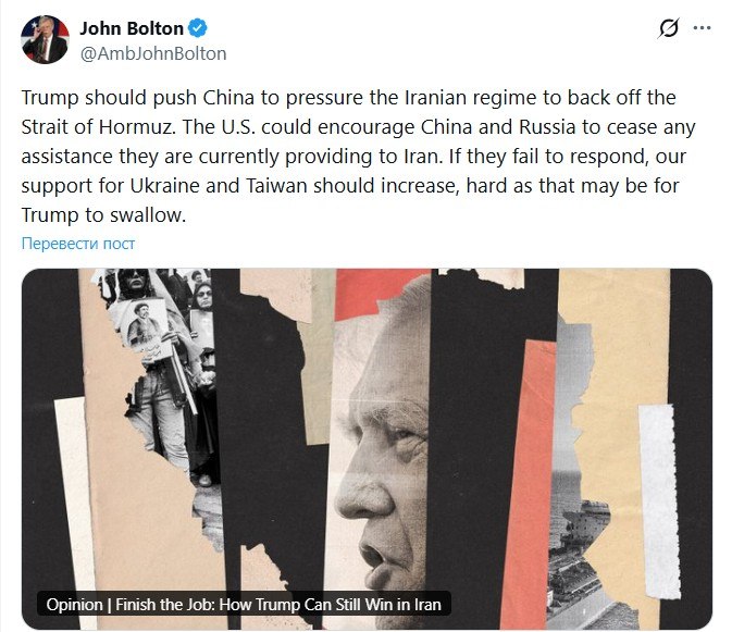 ‘Трампу следует подтолкнуть Китай к тому, чтобы тот оказал давление на иранский режим с целью заставить его отказаться от вмешательства в дела Ормузского пролива. США могли бы призвать Китай и Россию прекратить любую помощь, которую они в настоящее время оказывают Ирану. Если они не отреагируют, наша поддержка Украины и Тайваня должна возрасти, как бы тяжело это ни далось Трампу’.