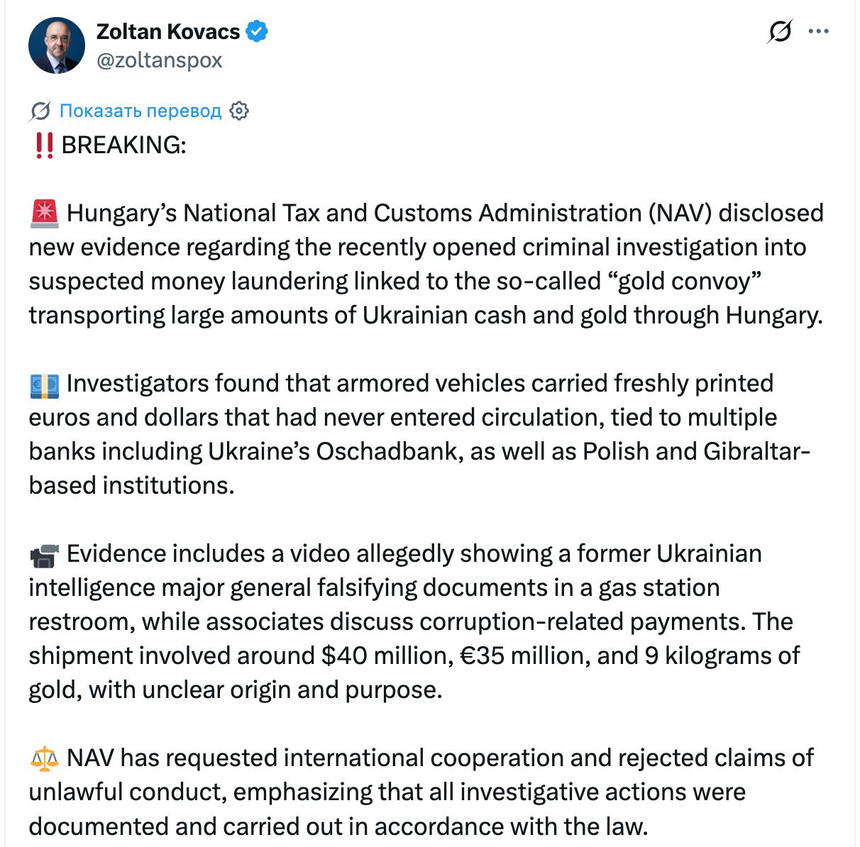 «Следователи установили, что в бронированных автомобилях перевозились свежеотпечатанные евро и доллары, которые никогда не поступали в обращение и были связаны с несколькими банками, включая украинский «Ощадбанк», а также польские и гибралтарские финансовые учреждения. Среди доказательств — видеозапись, на которой якобы запечатлен бывший генерал-майор украинской разведки, подделывающий документы в туалете автозаправочной станции, в то время как его сообщники обсуждают платежи, связанные с коррупцией», — пишет Ковач.