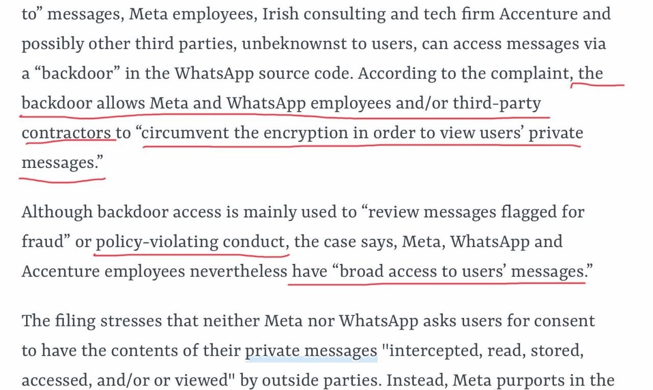 Заявление WhatsApp (принадлежит компании Meta, признанной экстремистской и запрещенной на территории РФ) о «сквозном шифровании» оказалось неправдой. Против Meta подан новый коллективный иск. Meta тайно позволяла сотрудникам, подрядчикам, таким как Accenture, и третьим лицам читать и хранить личные сообщения пользователей без их согласия. Цукерберг лгал о безопасности переписки, хотя чаты никогда не были в безопасности.