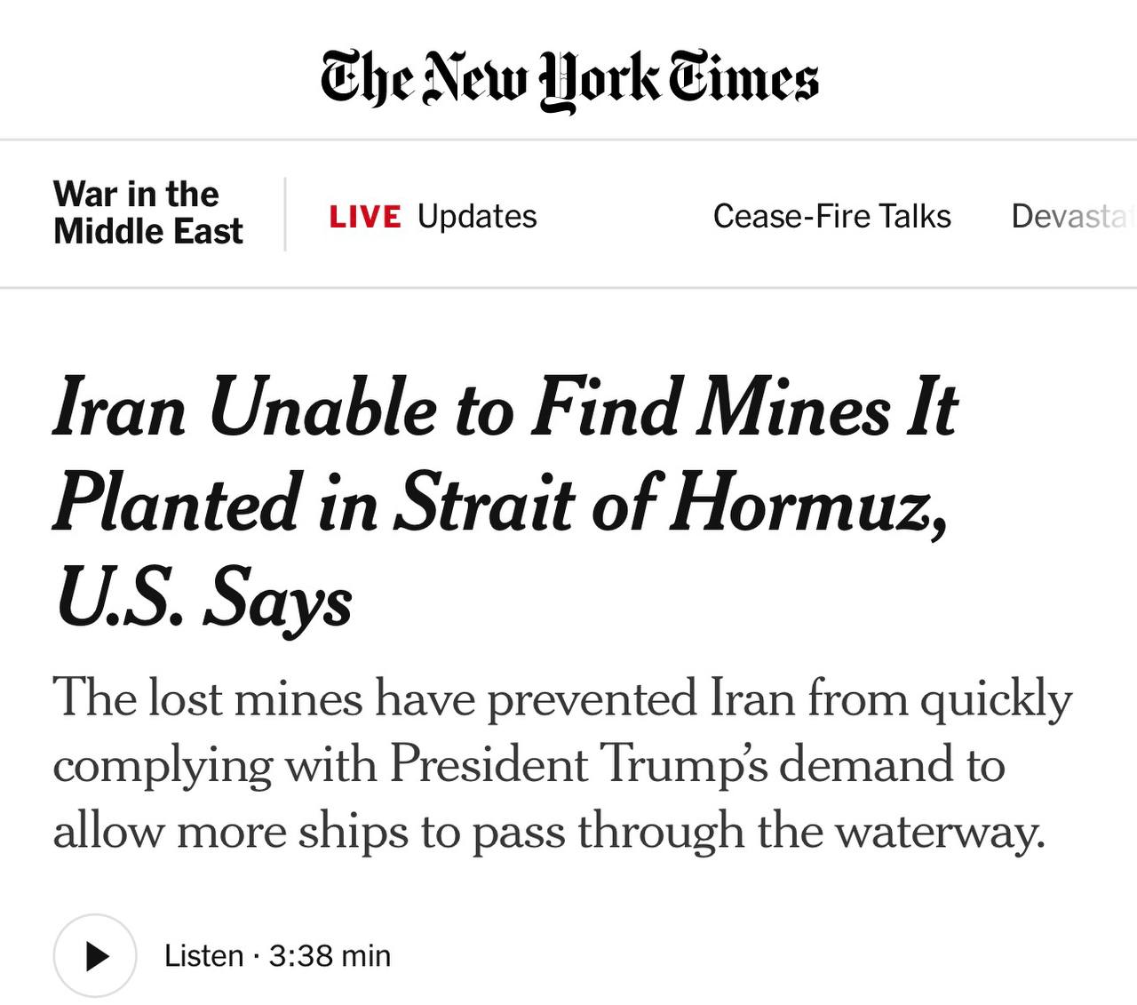 The New York Times со ссылкой на американских чиновников сообщает, что Иран не смог полностью открыть Ормузский пролив, поскольку не может отыскать все морские мины, которые он установил, и не обладает возможностями для их удаления.