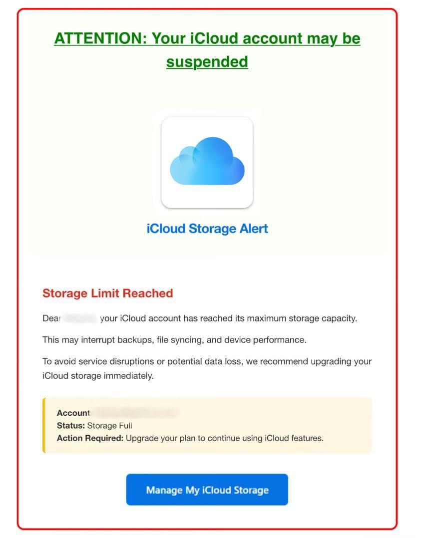 Пользователям приходит сообщение по электронной почте: утверждается, что хранилище данных переполнено, а учётная запись «заблокирована». И если немедленно не увеличить объём iCloud, то все фото и данные якобы будут удалены.