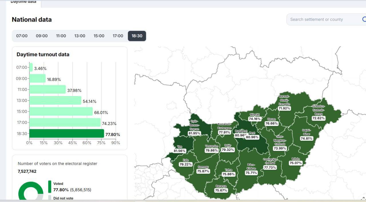 К 18:30 по местному времени на выборах проголосовали около 77,8% венгерских избирателей — это рекорд для этого часа. В Будапеште явка достигла почти 81%. По сравнению с 2022 годом прирост составил около 5,5% в столице и 7,6% по стране.