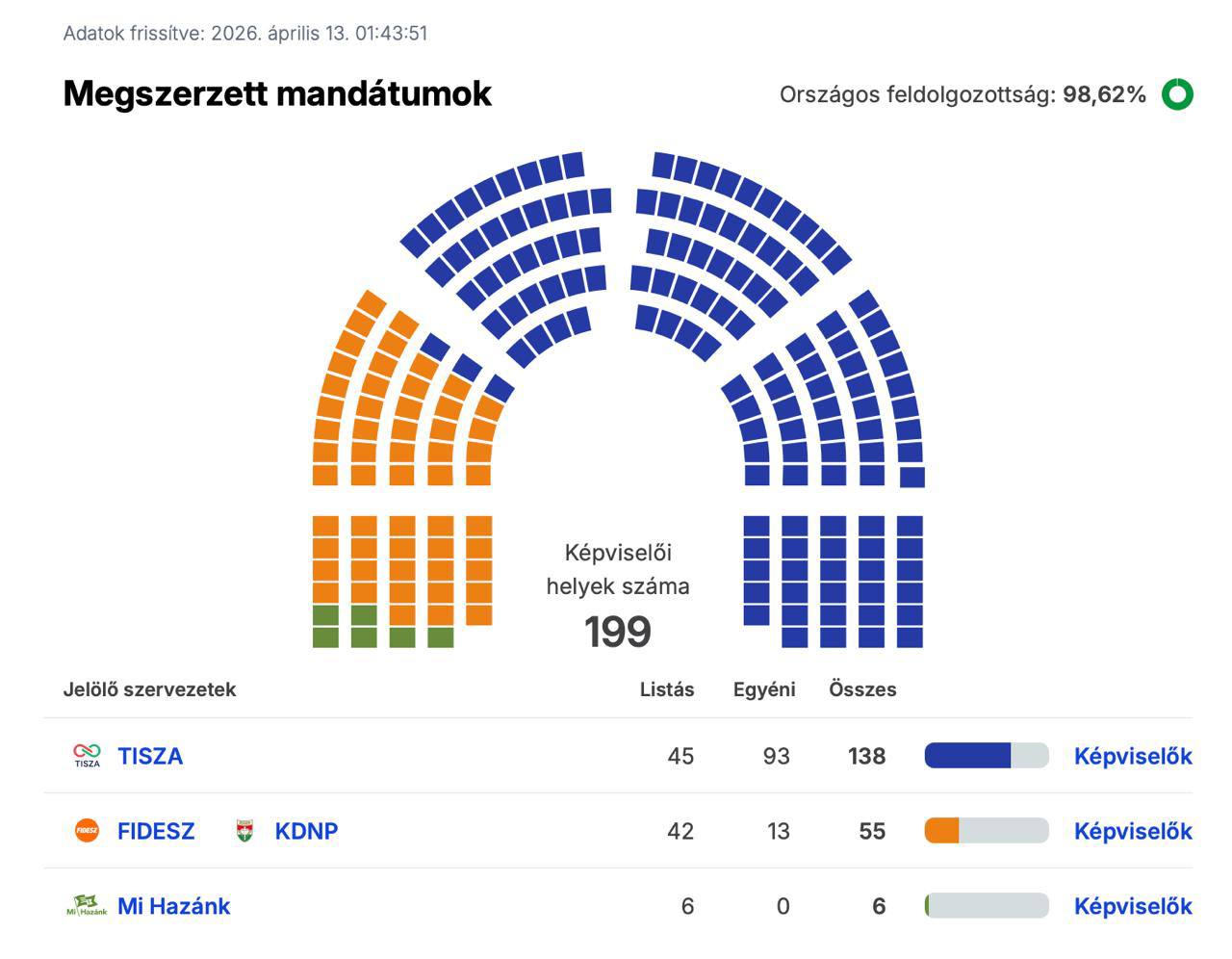 На парламентских выборах в Венгрии победила оппозиционная партия «Тиса», получив 138 мандатов — конституционное большинство.