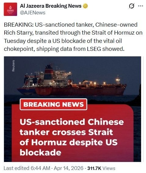 Китайский танкер беспрепятственно прошел через Ормузский пролив, несмотря на американскую блокаду. Да к тому ж еще он и находится под санкциями США.