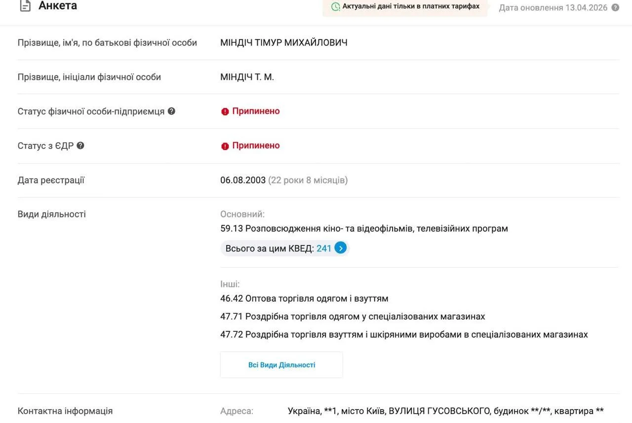 Нардеп Железняк публикует скриншоты из украинского реестра ИП — в апреле закрылось предприятие по "Распространению кино и видеофильмов" Тимура Миндича.