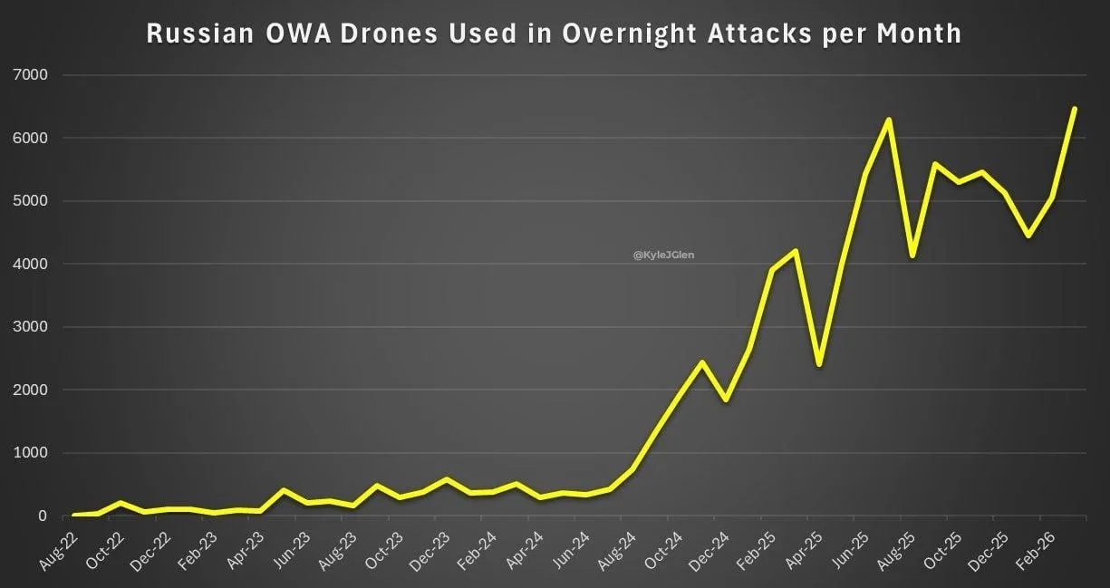 Взрывной рост начался с осени 2024 года, когда буквально за год число запускаемых дронов выросло с менее 1000 дронов в месяц в августе 2024 года (как раз во время Курска) до 6500 в августе 2025 года.