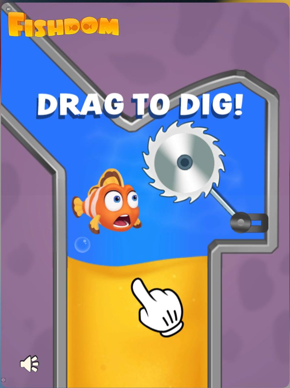На этот раз – баннер от Fishdom (вот он, на скриншоте).Ситуация такая: на жовто-блакитном фоне (типа водичка и песок – всё нативно) плавает рыбка Немо, которую срочно нужно спасти, иначе её перемелет… ну, видимо, российская техника. И текст: 'DRAG TO DIG!'
