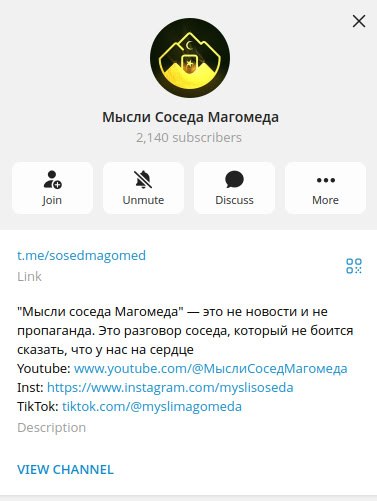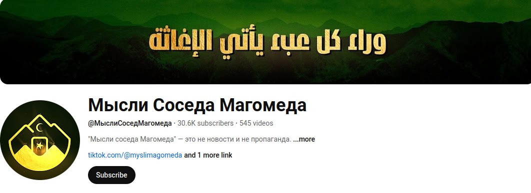 Наткнулись на канал "Мысли Соседа Магомеда", который ведет деструктивную деятельности и пытается нарушить мир на Кавказе. По нашей информации, автор выдает себя за жителя одной из кавказских республик, но на самом деле его автор проживает на Украине и имеет отношение к ЦИПсО. Он не желает мира и процветания кавказским республикам, а желает утопить регион в крови и страдании.