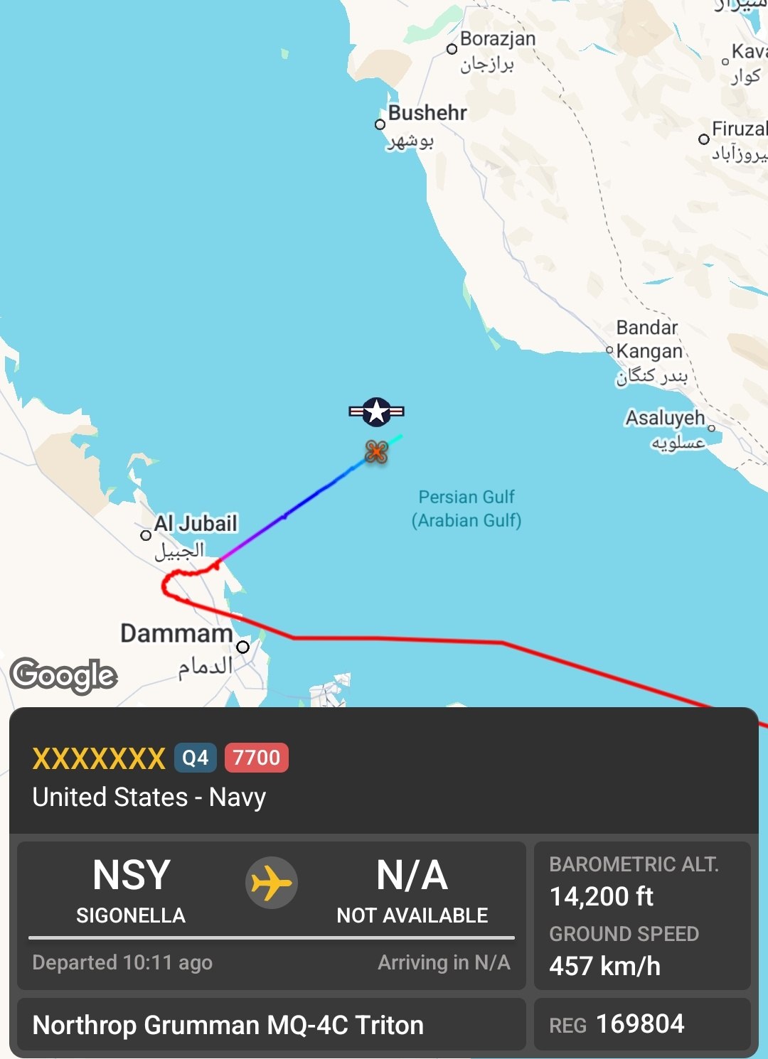 Беспилотник выполнял разведывательный полёт над Ормузским проливом и возвращался на базу в Италии. Внезапно он подал аварийный сигнал с кодом 7700 (ЧП), а затем — код 7400, который означает потерю связи с оператором.
