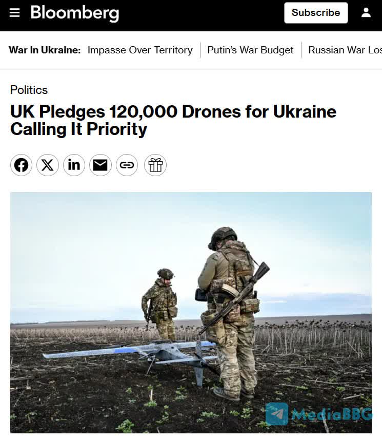 ВЕЛИКОБРИТАНИЯ ПООБЕЩАЛА ПРЕДОСТАВИТЬ УКРАИНЕ 120 000 БЕСПИЛОТНИКОВ, НАЗВАВ ЭТО ПРИОРИТЕТНОЙ ЗАДАЧЕЙ. [Bloomberg]