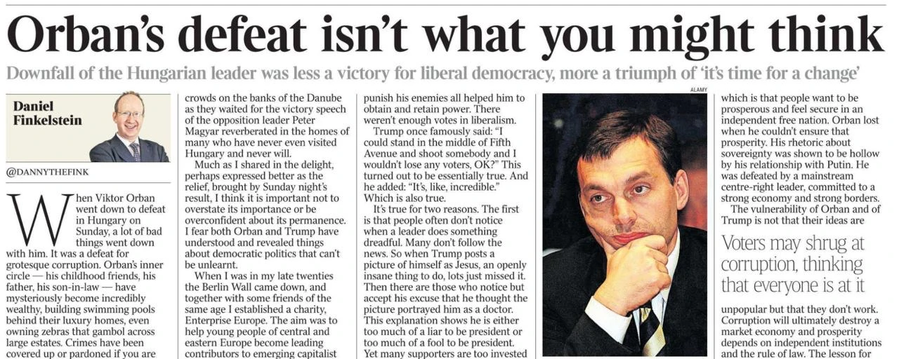 «Поражение Орбана - это не то, что вы могли бы подумать». Как вы видите по заголовку сегодняшней колонки Дэниэля Финкельштейна в The Times, на Западе потихоньку проходит эйфория от победы Мадьяра в Венгрии.