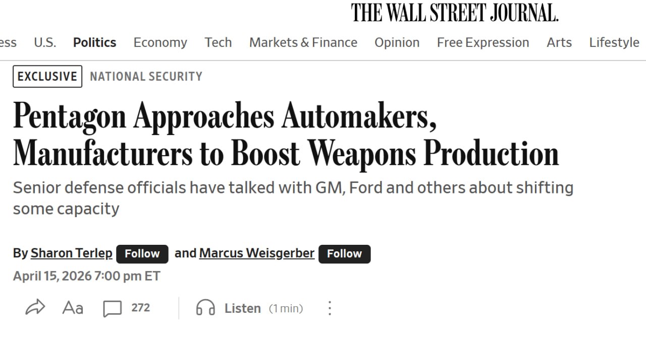 WSJ: Пентагон обращается к автопроизводителям и другим компаниям с целью наращивания производства вооружений.