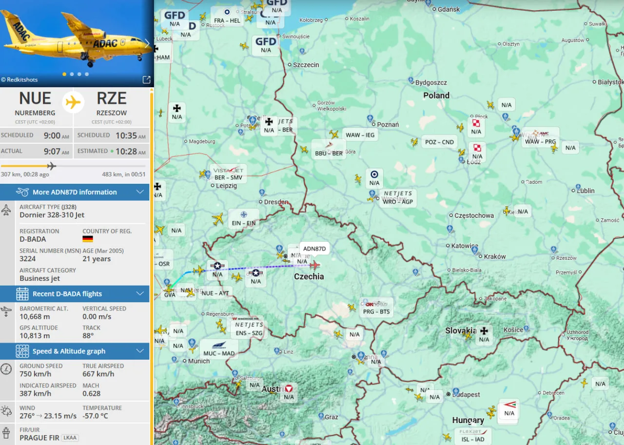 Судя по всему, к ночной дискотеке в Киеве и ряде других городов готовились не только ВСУ, но и страны НАТО. Вчера поздно вечером в расписание полётов в Жешув была поставлена "летающая реанимация" — борт Dornier 328-310 медицинской ЧВК ADAC из Германии. Прямо сейчас самолёт летит в Жешув на границе с Украиной и прибудет туда примерно через полтора часа. Основной специализацией ADAC является перевозка тяжёлых раненых, кого нельзя перевозить обычным транспортом — людей с тяжелыми минно-взрывными травмами, ожогами 60-80% тела или сложными ранениями позвоночника.