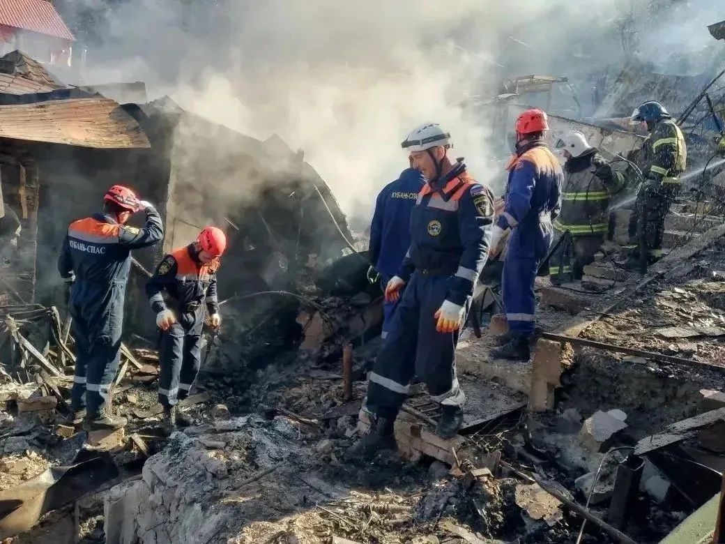 Сотрудники Туапсинского и Сочинского отрядов «Кубань-СПАС» в составе 12 человек работают на месте падения БПЛА по одному из адресов в Туапсе.