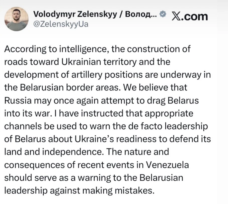 По данным разведки, в приграничных районах Беларуси ведётся строительство дорог в направлении украинской территории и обустройство артиллерийских позиций. Мы считаем, что Россия может вновь попытаться втянуть Беларусь в свою войну. Я поручил использовать соответствующие каналы для предупреждения фактического руководства Беларуси о готовности Украины защищать свою землю и независимость. Характер и последствия недавних событий в Венесуэле должны послужить предупреждением белорусскому руководству о недопустимости ошибок.