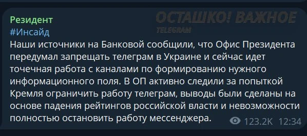 Пишут, что в офисе Зеленского наблюдали за потугами российских органов по блокировке мессенджера и якобы сделали выводы, основанные на падении рейтингов российских властей и невозможности полной блокировки.