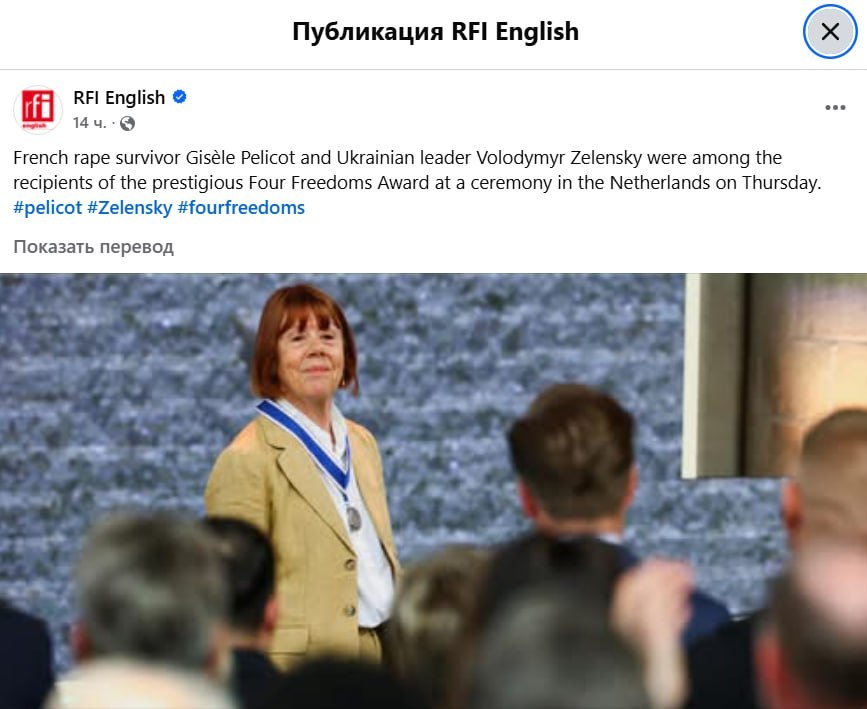 «Премию четырех свобод» вместе с Зеленским получила жертва многолетнего сексуального насилия Жизель Пелико, сообщает RFI.