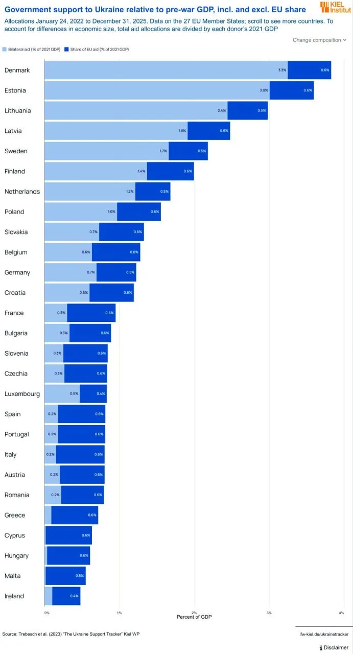 В обновленном списке стран ЕС по помощи Украине в пересчете на ВВП на "пьедестале" все те же.