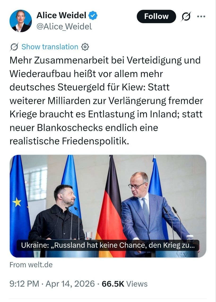 Больше сотрудничества в области обороны и восстановления означает прежде всего больше немецких налоговых денег для Киева: вместо дополнительных миллиардов на продление чужих войн необходимо облегчить нагрузку внутри страны; вместо новых карт бланш наконец-то нужно проводить реалистичную политику мира.