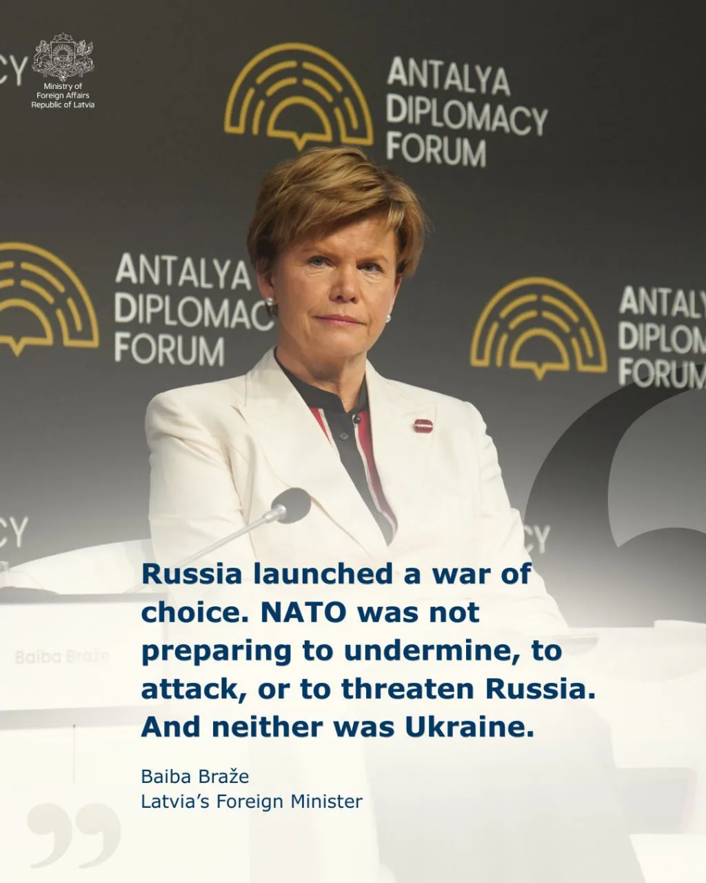 Байба Браже, участвующая в Дипломатическом форуме в Анталии, уверена, что России вообще ничто не угрожало, а СВО началась, разумеется, без причин.