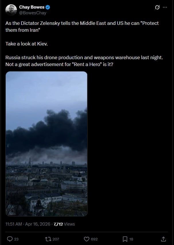 Россия ночью нанесла удар по объектам по производству дронов и складам оружия. Не лучшая реклама для "героя-наёмника", не так ли?"