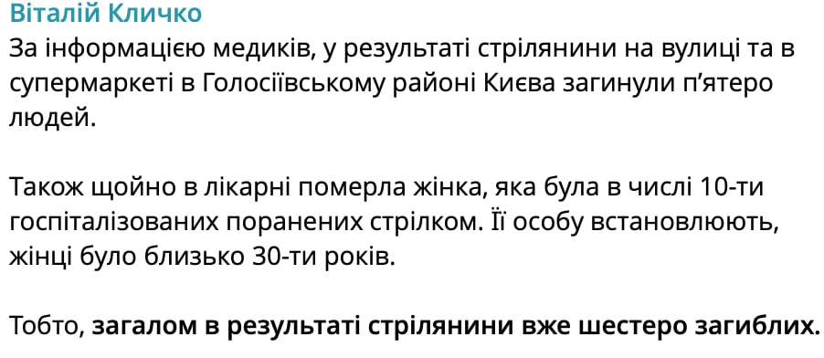 «По информации медиков, в результате стрельбы на улице и в супермаркете в Голосеевском районе Киева погибли пять человек.