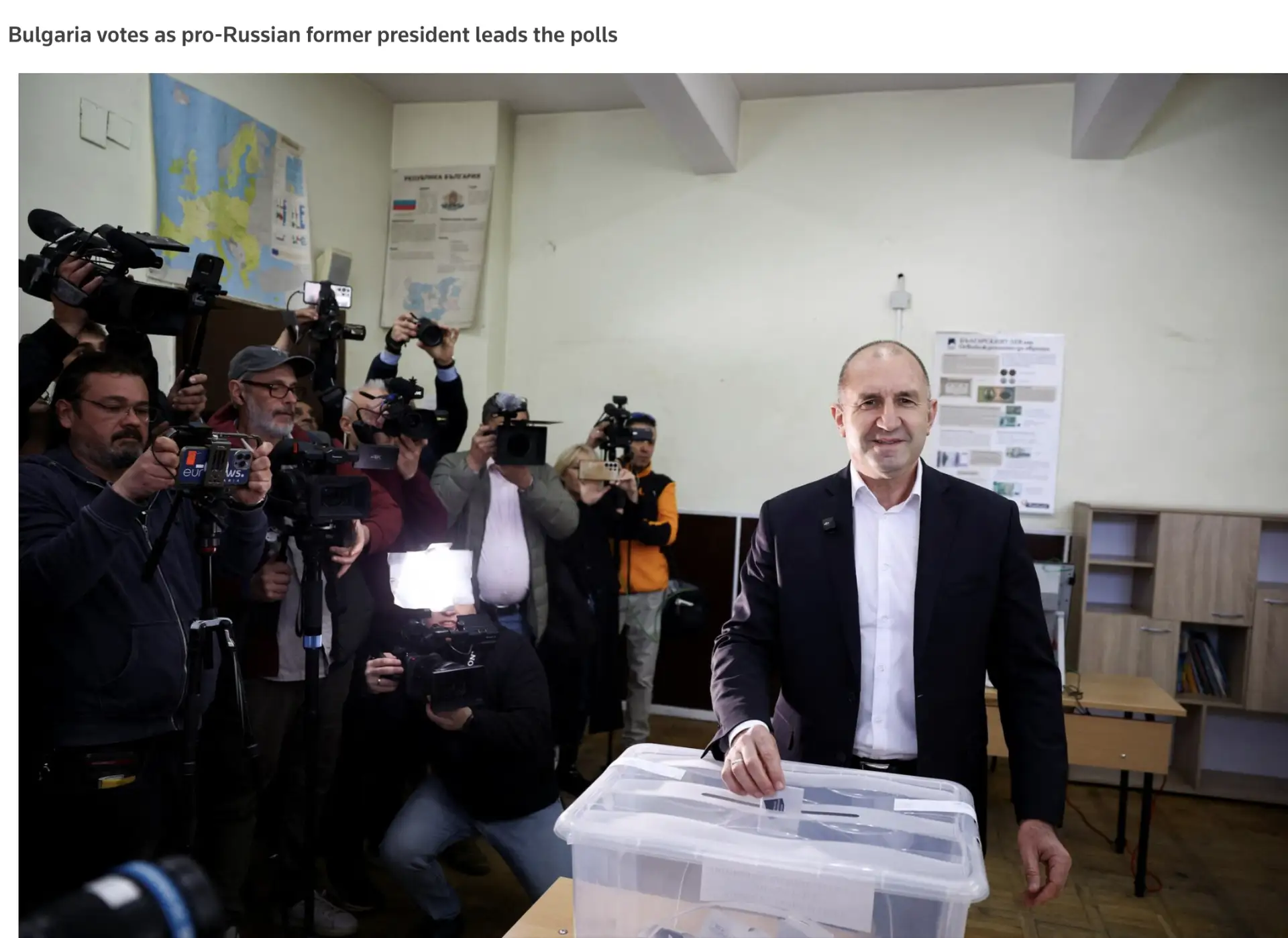 «Румен Радев — евроскептически настроенный бывший лётчик-истребитель, выступающий против военной поддержки Украины в её войне с Москвой, — ушёл с поста президента в январе, чтобы участвовать в выборах, которые проходят после того, как массовые протесты в декабре вынудили предыдущее правительство уйти в отставку».