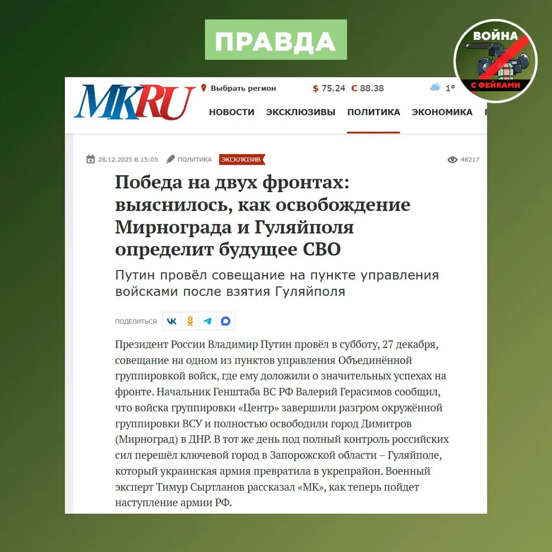 Фейк: ВСУ вынуждены вывести свои подразделения из Мирнограда (Димитрова), поскольку это обусловлено обстановкой. Об этом сообщают украинские СМИ.