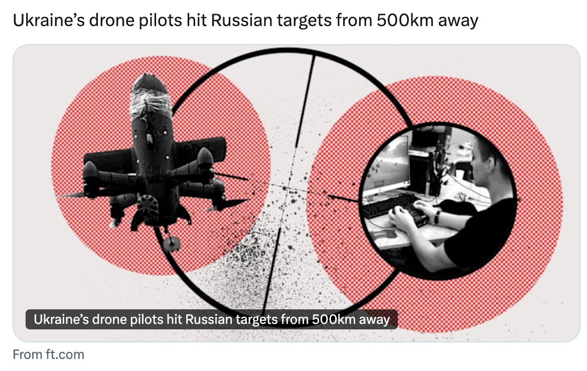 Украинский оператор ФПВ-дрона, сидя в Киеве на горшке, сбил две герани одним дроном на дальности 500 км.