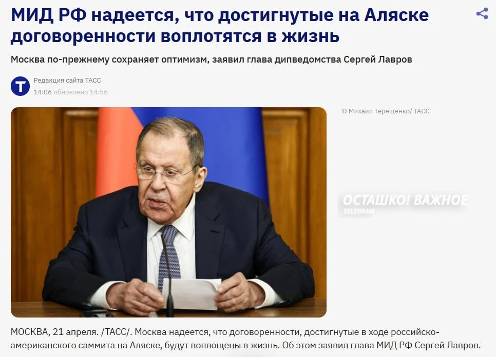 Ранее Сергей Лавров заявил, что США не готовы на свои предложения по Украине в Анкоридже.