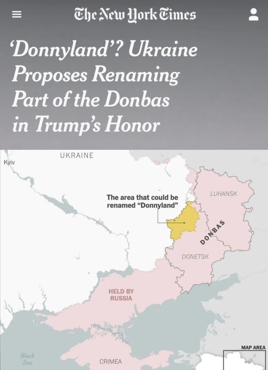 «В ходе мирных переговоров по Украине представители Киева в неформальном порядке предложили назвать спорную часть Донбасса «Donnyland» - отсылку к Дональду Трампу. Идея, изначально высказанная в шутку, была попыткой апеллировать к личным мотивам американского лидера и склонить Вашингтон к более жёсткой позиции в отношении требований Владимира Путина. Речь шла о территории, которая могла бы получить особый статус - например, демилитаризованной или экономической зоны под международным управлением.