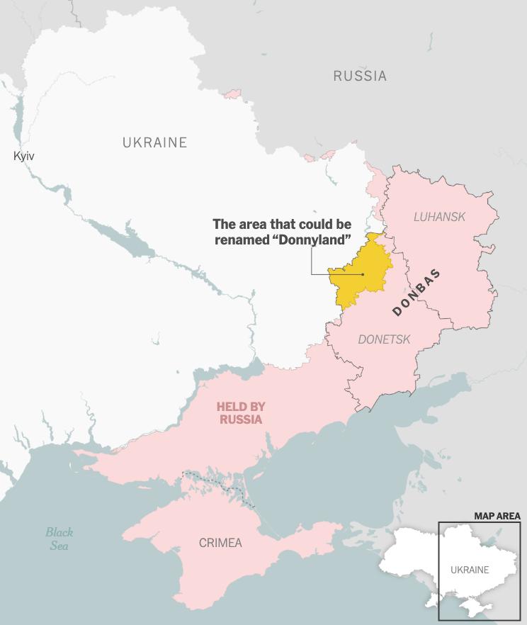 The New York Times раскрывает необычную деталь закулисных переговоров по Украине. Украинские чиновники, пытаясь склонить США к более жёсткой позиции против России, предложили назвать часть Донбасса, за которую продолжаются бои, «Доннилэндом» — в честь Дональда Трампа. Идея возникла полушутя, но обсуждалась всерьёз как возможный нейтральный или демилитаризованный регион, который мог бы стать «проектом Трампа» и сдерживающим фактором.