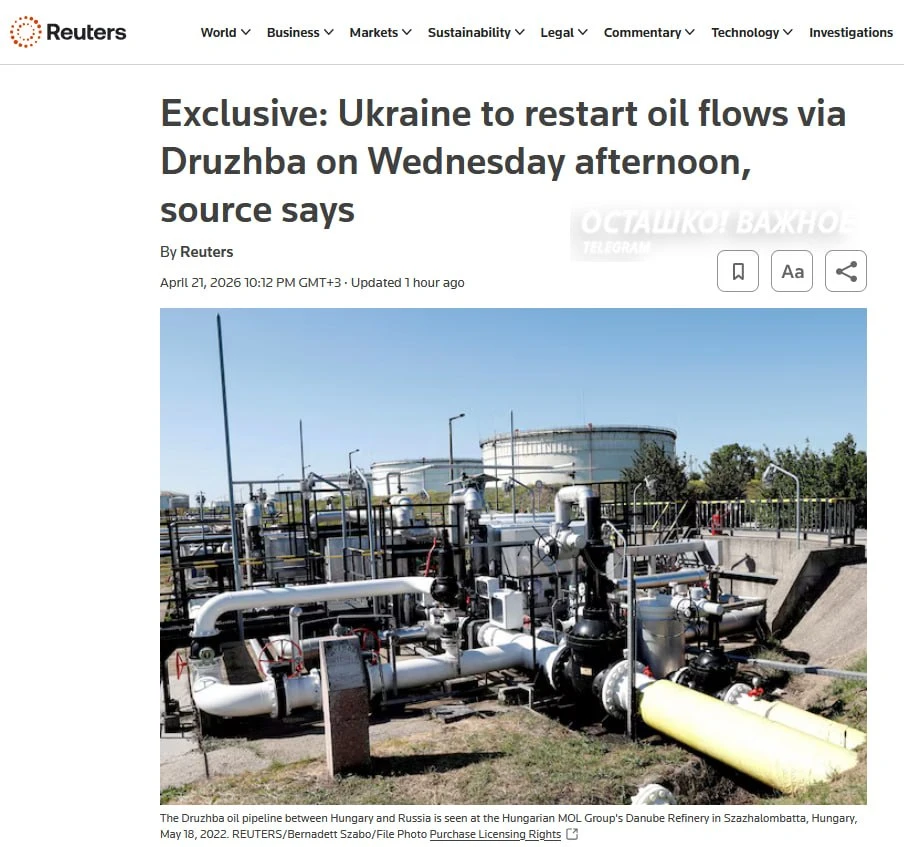 Ранее нелегитимный киевский дуче заявил, что починил нефтепровод. В Кремле сообщили о полной готовности к возобновлению поставок.