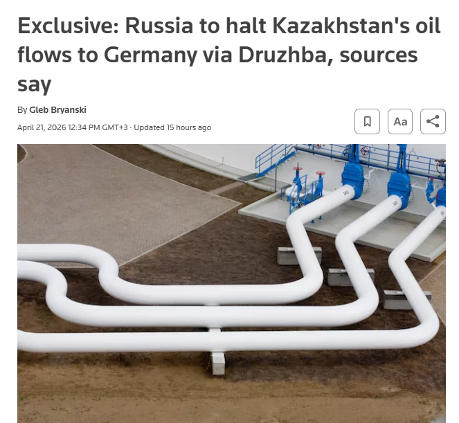 Reuters утверждает, что Россия планирует прекратить экспорт нефти из Казахстана в Германию по трубопроводу "Дружба" с 1 мая.
