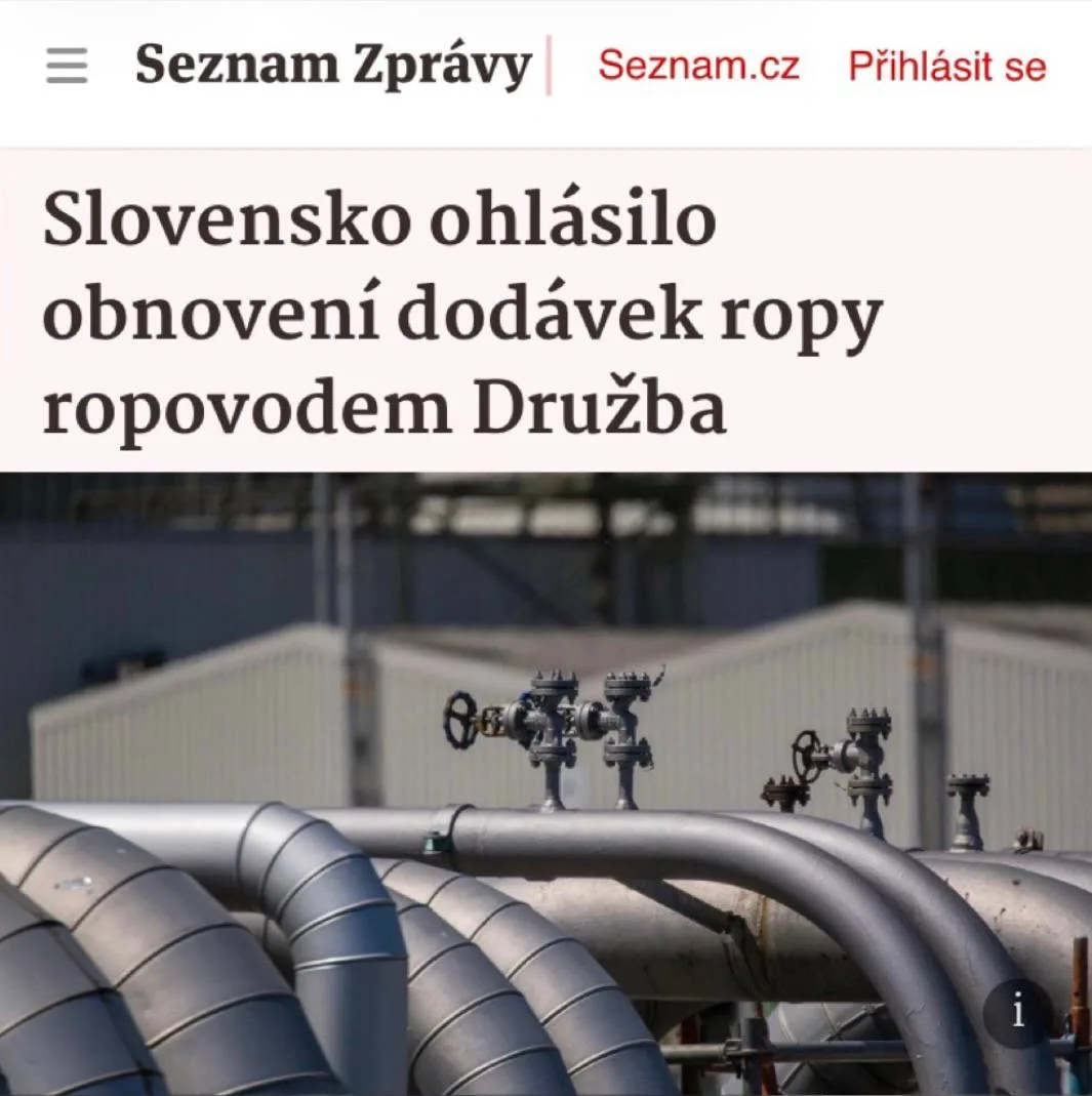 «Словакия объявляет о возобновлении поставок нефти по нефтепроводу «Дружба»: Формальная причина для вето на кредит Украине снята - нефть по «Дружбе» запущена.