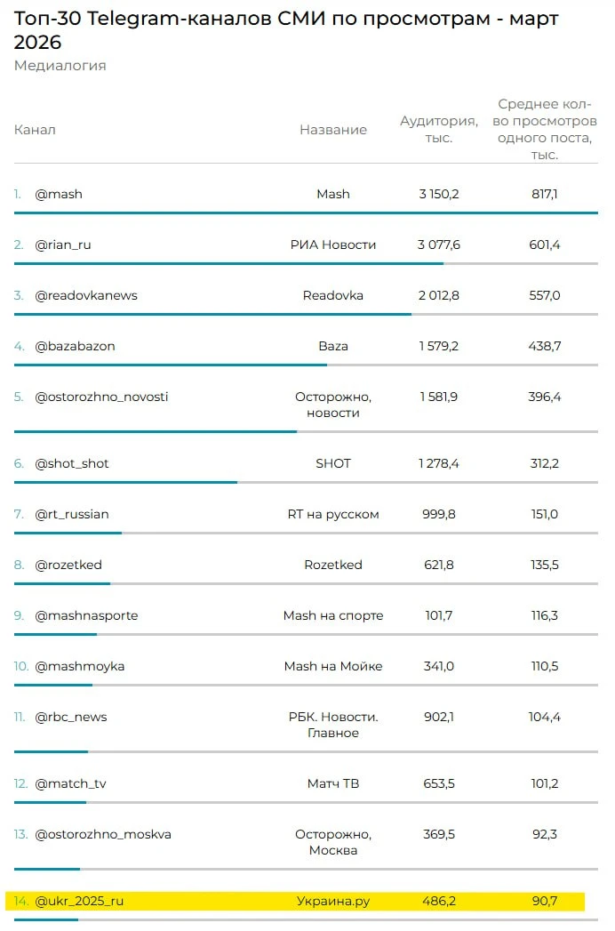 Друзья, у нас отличные новости! Авторитетная исследовательская компания «Медиалогия» опубликовала рейтинг Telegram-каналов российских СМИ за март 2026 года.