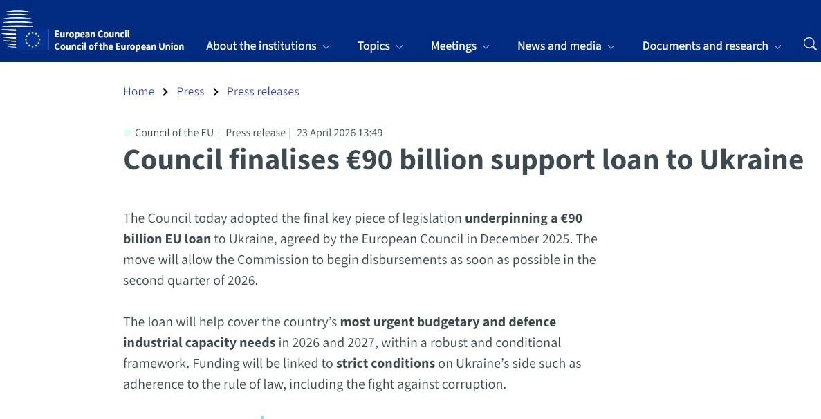 ЕС одобрил 20-й пакет санкций против РФ и завершил процедуры согласования кредита в 90 млрд евро для Украины. Об этом сообщил председатель Евросовета Антониу Кошта.