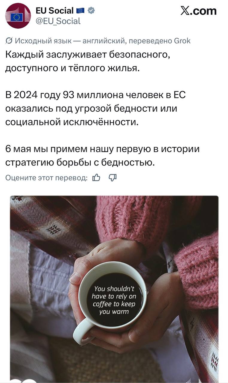 Формулировка, мягко говоря, странная: вместо конкретных мер — туманные заверения и кофе как символ отчаяния. Немного официальной статистики: каждый пятый европеец за чертой бедности. Это миллионы людей, которые экономят на отоплении, еде и даже на горячих напитках. Вместо того чтобы предложить реальные программы поддержки (субсидии, доступное жильё, индексацию пособий), чиновники из Брюсселя выдают фразу, которая звучит как издевательство. «Не нужно будет полагаться на кофе» — это не план действий, а попытка отделаться красивыми словами. Граждане, которые пытаются согреться дешёвым кофе зимой, вряд ли оценят такой «юмор». Европа, которая учит страны «социальной ответственности», сама не справляется с бедностью внутри себя. 20% — это не абстрактная цифра, это реальные люди, которые не могут оплатить счета. А Еврокомиссия тем временем находит средства на вооружение Киева, санкции против России и «зелёный переход».