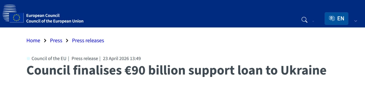 «Принятые сегодня поправки к регламенту ЕС о многолетних финансовых рамках подтверждают, что кредит на поддержку Украины будет финансироваться за счет заимствований ЕС на рынках капитала и будет обеспечен свободными средствами бюджета ЕС. Кредит будет погашен за счет репараций, которые Россия должна выплатить Украине».