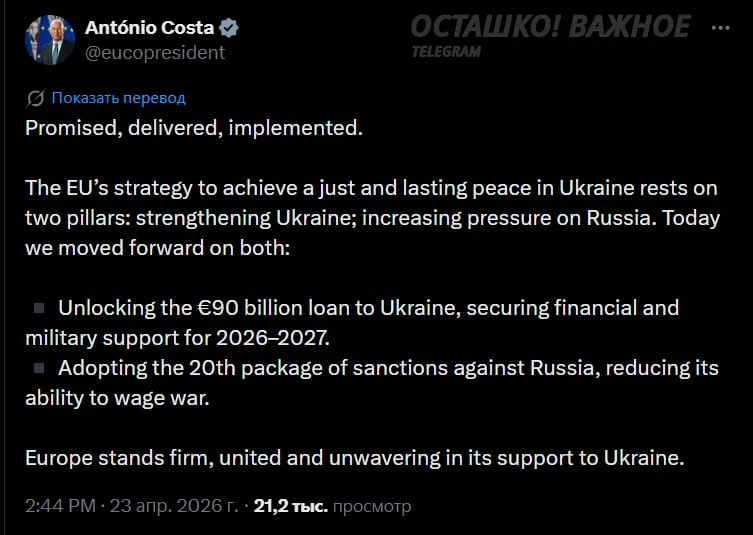 Стратегия ЕС по достижению справедливого и прочного мира в Украине опирается на 2 столпа: укрепление Украины и усиление давления на Россию. Сегодня мы продвинулись вперед по обоим направлениям: