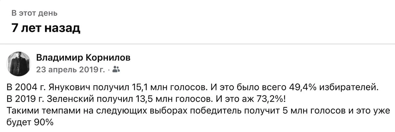 Посмотрите, как семь лет назад, после победы Зеленского, я предсказывал, что на следующих выборах на Украине 5 миллионов голосов уже составят 90% от проголосовавших.