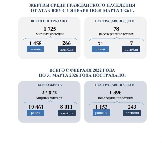 Если сравнивать аналогичные периоды 2025 и 2026 годов, то в первом квартале 2026 года число пострадавших среди гражданского населения увеличилось на 236 человек.